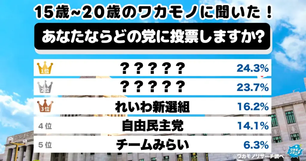 15歳~20歳の若者に聞いた!投票してみたい政党ランキング1位は「参政党」僅差で「国民民主党」が2位という結果に